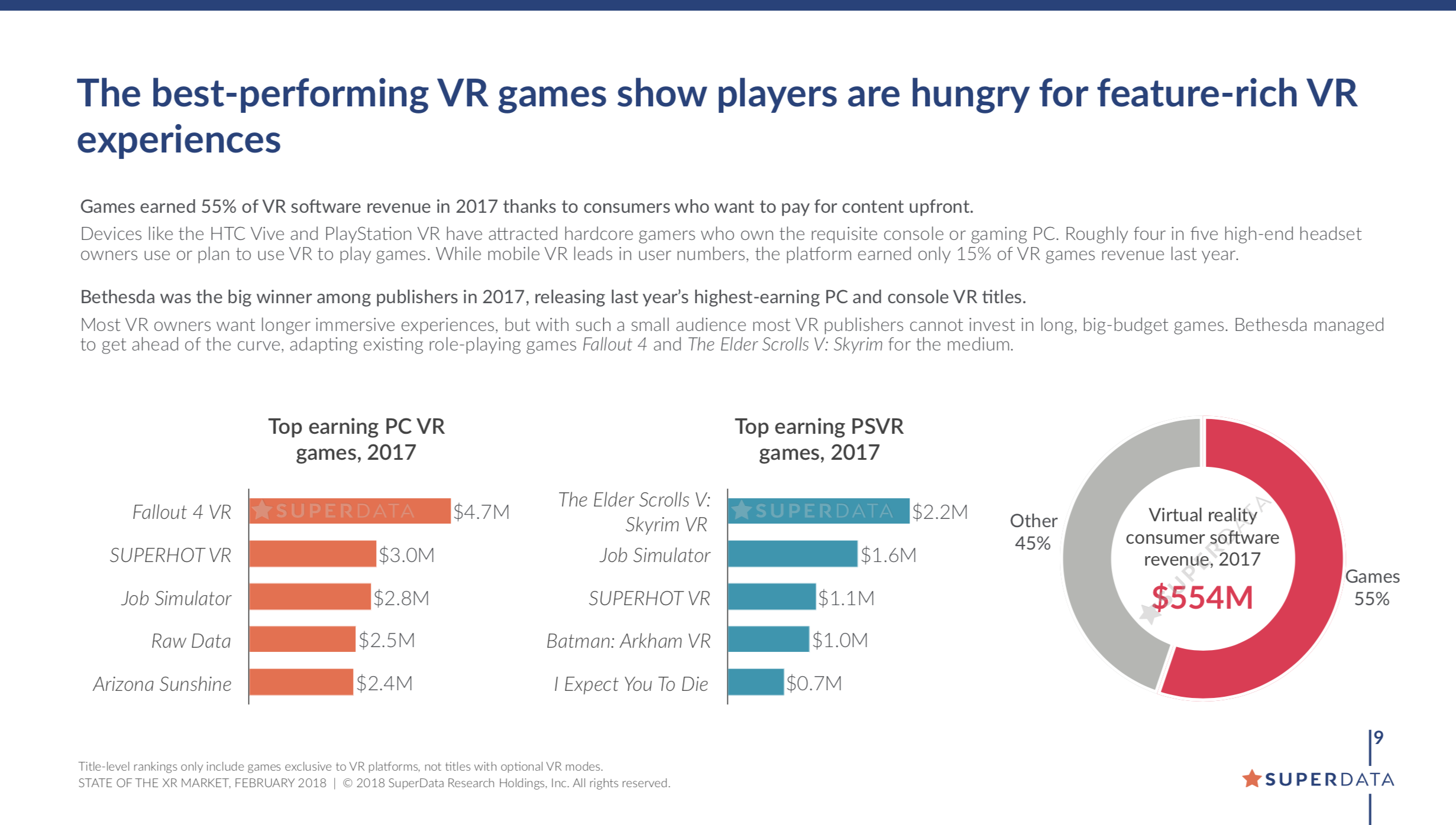 In this new market brief from SuperData’s gold standard XR research, stakeholders will gain insight into the VR/AR/MR market and its growth, the top VR games and revenues, case studies of the greatest successes, and insights on the XR development landscape.